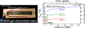 Also seeking a better electrolyte for lithium-ion batteries, researchers at the University of California, Irvine experimented with gels, which are not as combustible as liquids. They tried coating gold nanowires with manganese dioxide, then covering them with electrolyte gel. While nanowires are usually too delicate to use in batteries, these had become resilient. When the researchers charged the resulting electrode, they discovered that it went through 200,000 cycles without losing its ability to hold a charge. That compares to 6,000 cycles in a conventional battery.