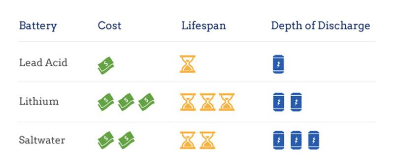 Batteries used in home energy storage typically are made with one of three chemical compositions: lead acid, lithium ion, and saltwater. In most cases, lithium ion batteries are the best option for a solar panel system, though other battery types can be more affordable.