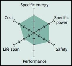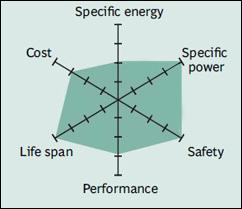 Figure 5 shows the spider web of a typical Li-manganese battery. The characteristics appear marginal but newer designs have improved in terms of specific power, safety and life span. Pure Li-manganese batteries are no longer common today; they may only be used for special applications.