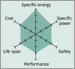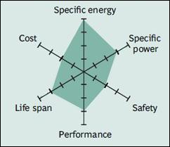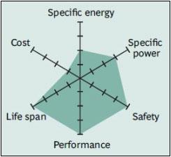 Figure 5 shows the spider web of a typical Li-manganese battery. The characteristics appear marginal but newer designs have improved in terms of specific power, safety and life span. Pure Li-manganese batteries are no longer common today; they may only be used for special applications.